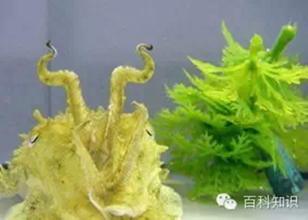 图中这只乌贼正在模仿一种水族植物。这种乌贼能伪装成任何水生生物,模仿各种姿势和颜色,以躲避天敌。它们之所以能够自如变换颜色,是因为其皮肤里有带色素的液囊。乌贼能够控制液囊的大小,从而根据周围环境随时改变颜色。